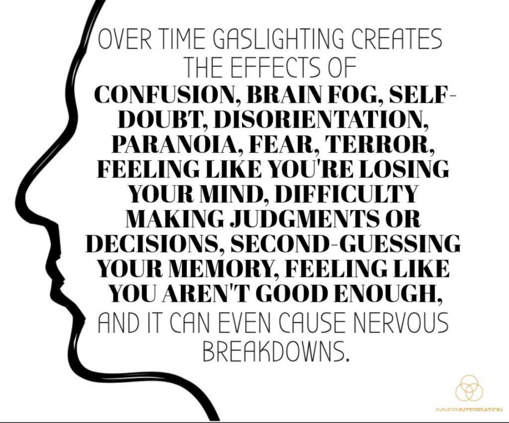 For example, my x-partner would trivialise my feelings about my oldest son, dismissing hurt and grief I was suffering when I lost time. He would tell me that my friends or their partners didn’t like me,. He would say that they had indicated to him that they did not want to spend time with me, or see my child. He would tell me accounts of past events, and then change the details around later. Often he would tell me that I had imagined conversations/arguments that we had the day before.